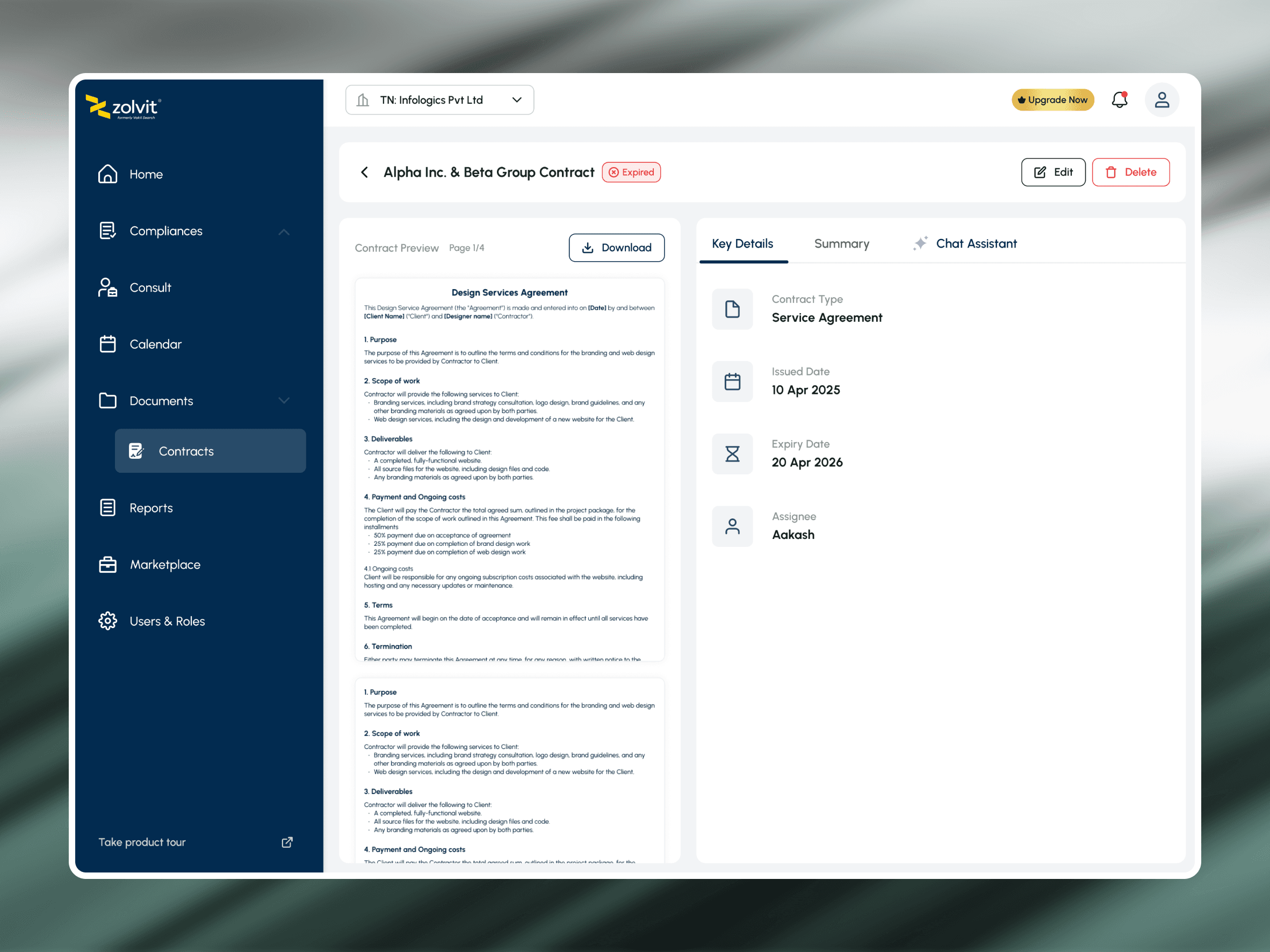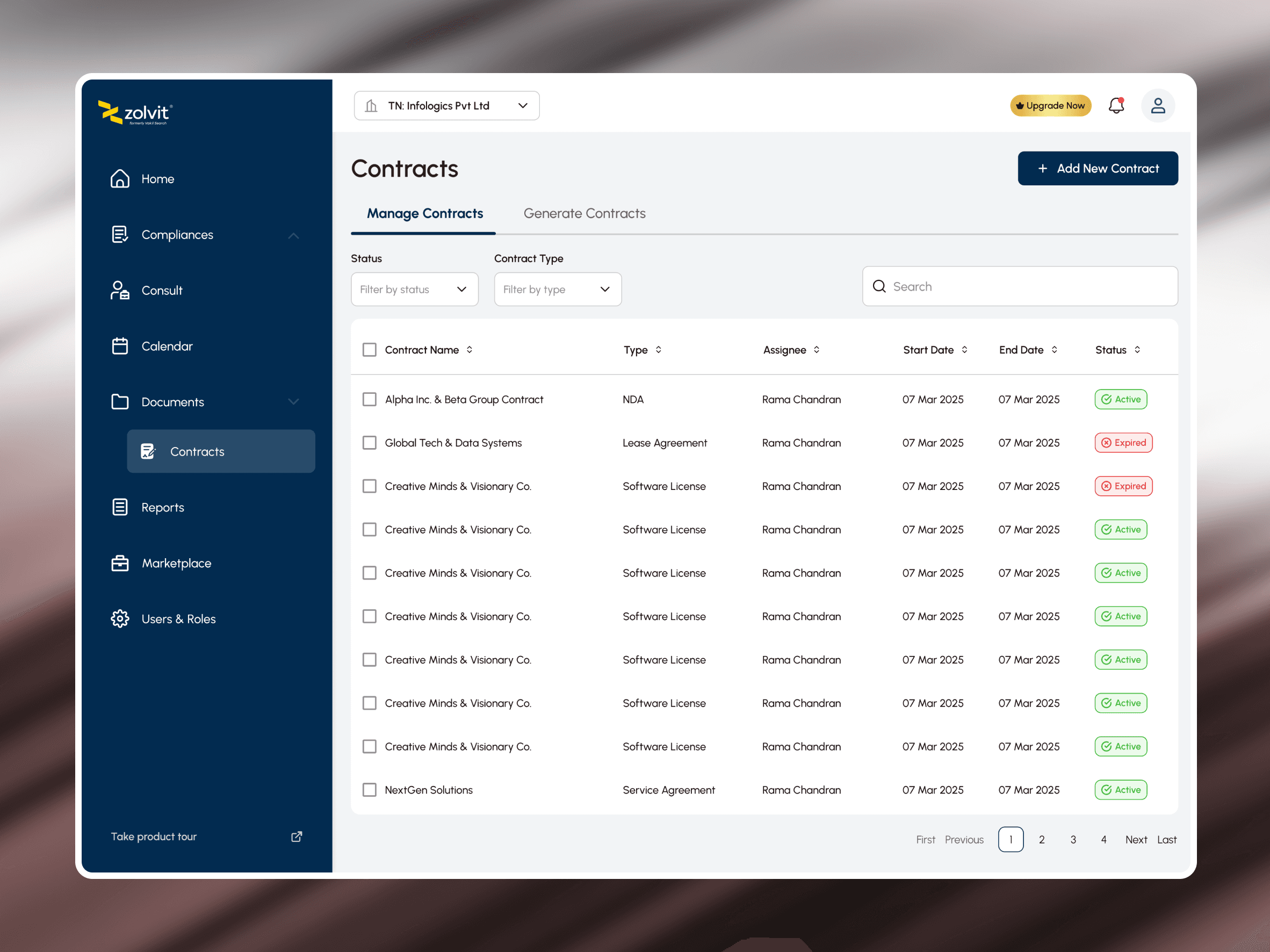 Actionable hierarchy: The “Manage Contracts” view provides status-based organization (Active, Expired, Expiring Soon) so teams know where attention is needed first.