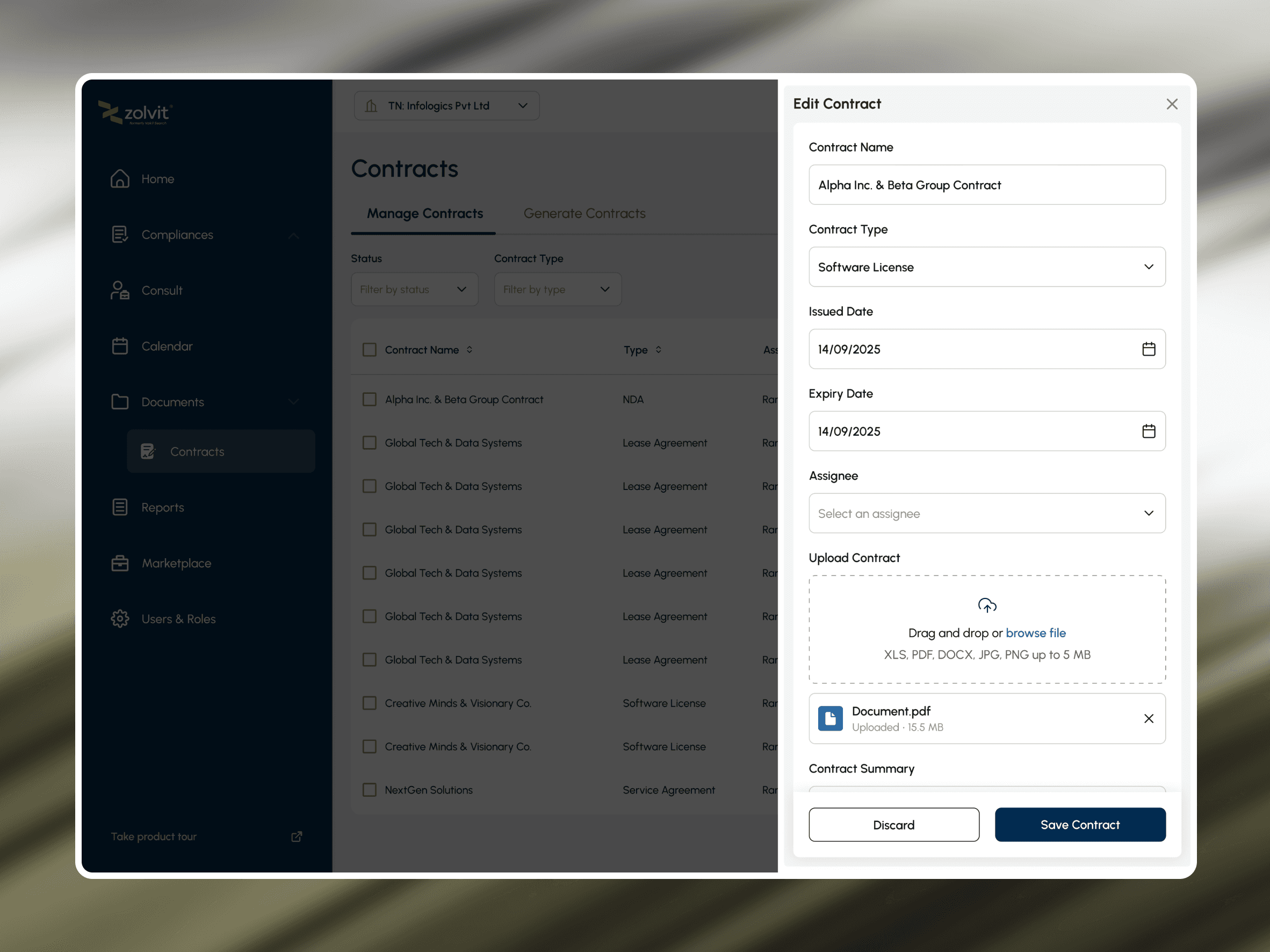 The Contracts module was designed to do more than just store documents — it became a live workspace for compliance teams.