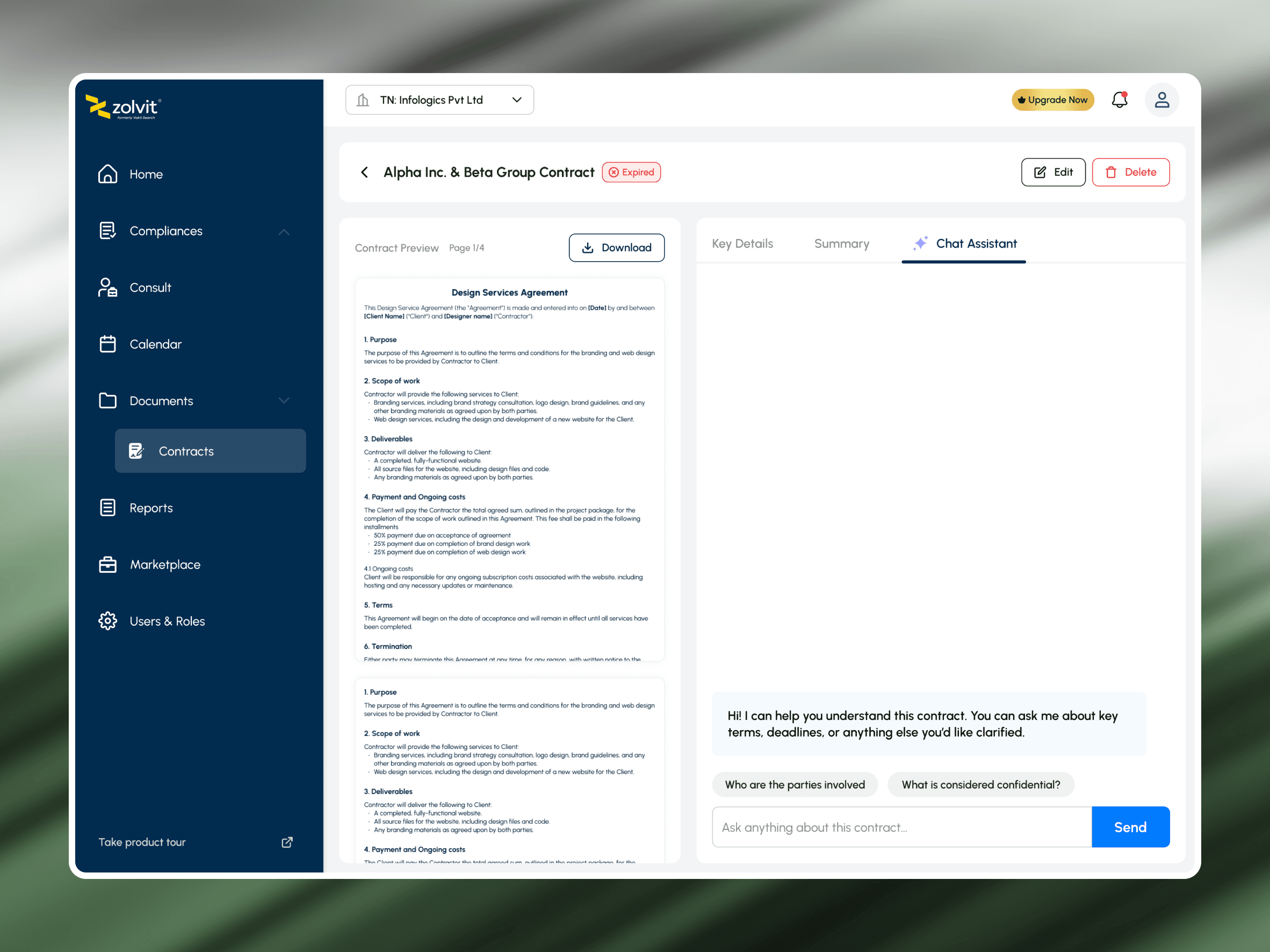 Contextual intelligence: Each contract preview includes quick key details, a document summary, and an AI-powered Chat Assistant that can interpret key terms or renewal details instantly.